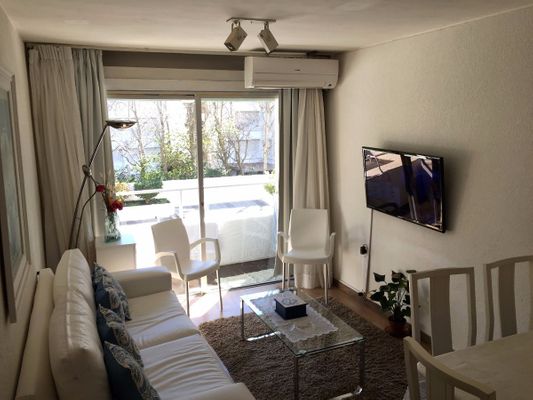 Cuenta con 2 dormitorios, 1 baño, cocina definida, living comedor con aire acondicionado, terraza, garaje y cochera de cortesía, bien equipado, luminoso, portero las 24 horas.