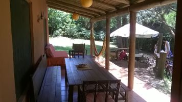 Dos dormitorios con mosquiteros y ventiladores de techo, muy fresca. Un lugar ideal para el descanso y el contacto con la naturaleza. Con un gran alero de cara al parque arbolado y a la sierra. Casita de madera para juegos infantiles. Otra ducha exterior al sol para la vuelta de la playa. Amplio parque con mucha sombra con cerco perimetral vegetal. Se permiten mascotas.