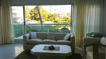Luminoso apartamento con hermosa terraza esquinera, vista lateral al mar y amplios ventanales con vista a jardines.Tiene 2 dormitorios y 2 baños completos, cocina completa, calefacción, 2 TV Flat con servicio de cable, WIFI en todo el apartamento y en áreas comunes. Cochera propia con lugar fijo. Servicio de mucama incluído en el valor del alquiler.