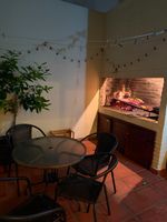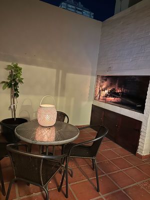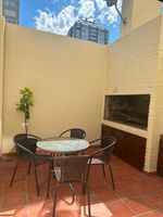 Amplia terraza con parrillero de uso exclusivo, con mesa, sillas de patio y sombrilla.
