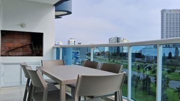Moderno apartamento con vista al mar y a la isla. Muy cómodo para 6 personas, 1 dormitorio matrimonial en suite con vestidor, 1 dormitorio para 3 personas con baño en suite y 1 dormitorio para 1 persona y baño social. Completo con ropa blanca. La cocina posee lavadero con lava-secaropas y vajilla completa y lavavajilla. El balcón cuenta con una mesa para 6 personas y un lindo parrillero con vista al mar.
