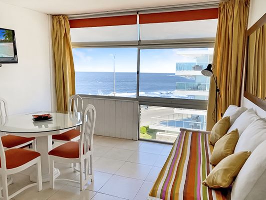 Apartamento con increíble vista al mar, luminoso, un dormitorio en suite con cama sommier matrimonial y aire acondicionado, cocina con barra desayunadora y en el living 2 camas marineras, capacidad para 4 personas cómodamente.