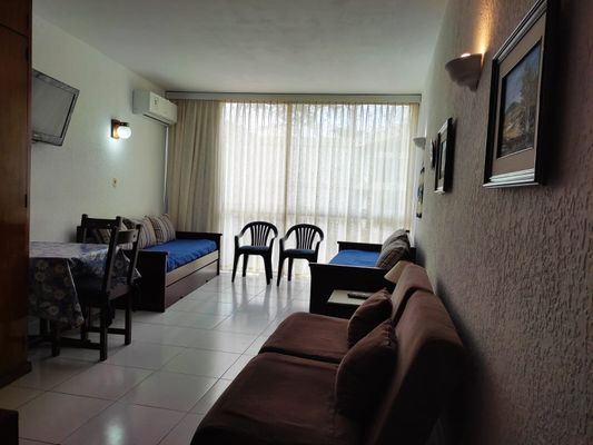 Monoambiente, ubicado en el edificio Anillo I de Arcobaleno, con capacidad para 4 personas, derecho a piscina, bien equipado. Tiene 2 camas marineras, 2 sofás, mesa y 4 sillas, placares, tv 32", heladera con freezer, horno microondas, anafe a supergas, horno eléctrico, cafetera y jarra eléctricas, vajilla. Baño completo, con bidet.