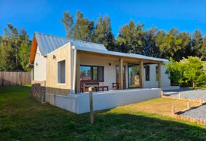 1400 m2 de terreno, con cerco de madera que le da mucha privacidad a la casa, que se relaciona con el terreno a través de grandes ventanales.