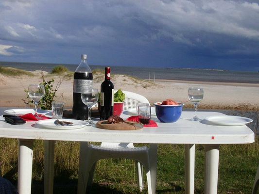 Casa sobre terraza, frente a desembocadura del arroyo y sobre un camino privado Gran vista. Cuatro dormitorios, dos con cama matrimonial, dos con cucheta. Gran living, patio, frente y otros ambientes, equipada con electrodomésticos, incluyendo lavarropa automático. Vajilla para 12 personas. Wifi y antena de DirecTV prepago. Uno de los pocos lugares de la costa no separados por una rambla.