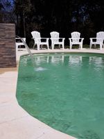 Barbacoa con parrillero, mesa y sillones al lado de una piscina de 8 x 4 mts. de agua salada y climatizada.