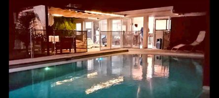 Amplia piscina climatizada con asiento dentro del agua para hidromasaje y cascada de agua regulable iluminada ,