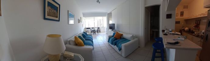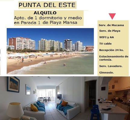 Frente a playa mansa en parada 1. Un dormitorio y medio capacidad 4 personas. Dispone de : AA , wifi, Direct tv, serv.. de mucama y playa, gimnasio, estacionamiento de cortesía, recepción 24 hs, y lavadero..