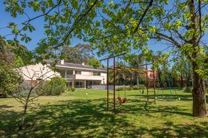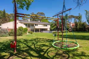 Exterior con gran jardín parquizado, piscina, parrillero con vista al jardín, área de fogón y juegos infantiles.