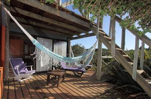 En el jardín reposeras, hamacas paraguayas, mesas, sillas, sombrillín y sillas y sombrillas de playa.