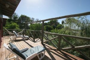 En planta alta dispone de dos cómodos dormitorios,uno con cama matrimonial y otro con 3 camas individuales, baño completo con bañera y amplio living comedor con cocina integrada. En el exterior un deck con reposeras y hamaca paraguaya.